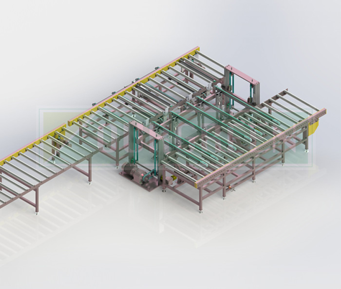 南京歐格設(shè)計制造的后續(xù)自動化生產(chǎn)線使用機(jī)械推手將板材推入碼垛堆疊,堆疊成包裝要求高度,輸出打包。