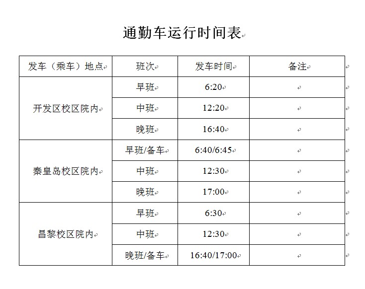 本學期通勤車擬定自8月24日起開始運行,早晚分別由昌黎、開發區校區對開一輛(備車做好準備),具體運行時間為早6:30、晚16:40(途徑秦皇島校區發車時間分別為6:50和17:00),各校區發車地點不變(昌校區綜合樓前乘車點,秦校區老辦公樓西南側乘車點、開發區校區綜合樓北側乘車點),中午不再安排通勤。請各位教職工按照疫情防控期間的乘車要求,做好個人防護,主動出示證件并配合司機師傅驗證。