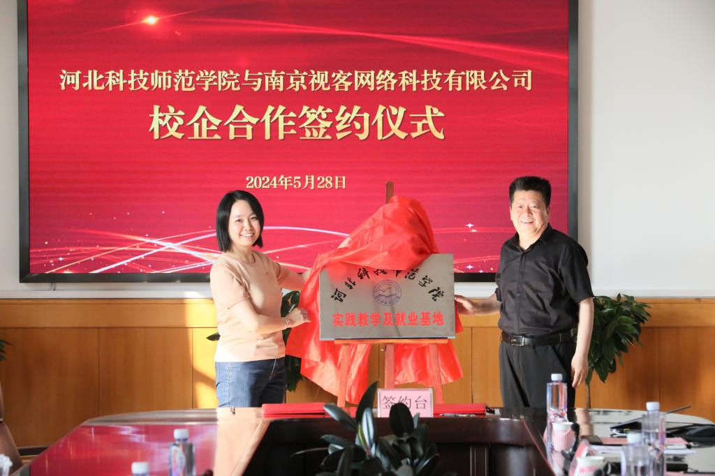 校黨委常委、副校長馮瑞銀與南京視客網絡科技有限公司副總經理繆繼紅共同簽署了校企合作協議,并舉行了實踐教學與就業基地揭牌儀式。