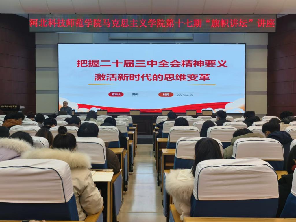 2024年11月29日,旗幟講壇第十七期講座在秦皇島校區學術報告廳舉行。本次講座由馬克思主義學院田輝主講,該學院教師代表和秦皇島校區各學院學生代表在現場聆聽講座。