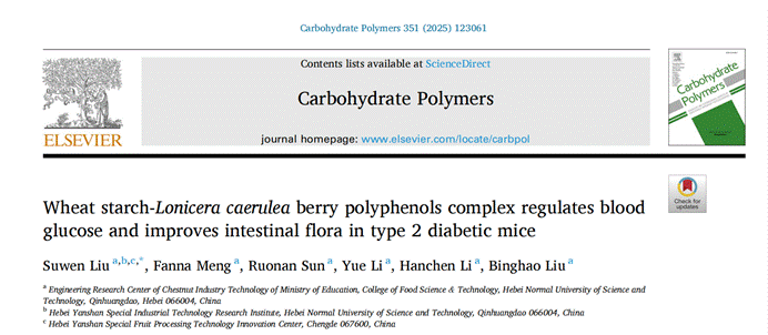 近日,我校食品科技學院劉素穩教授課題組在《Carbohydrate Polymers》(中科院1區Top期刊,IF=10.7)發表了題為“Wheat starch-Lonicera caerulea berry polyphenols complex regulates blood glucose and improves intestinal flora in type 2 diabetic mice”的最新研究成果。該成果得到國家自然科學基金青年基金(32101952)、河北省自然科學基金杰出青年科學基金(C2024407033)、河北省自然科學基金面上項目(C2023407040)資助和板栗產業技術教育部工程研究中心的支持。(編輯:孫艷敏 審核:王榮加)