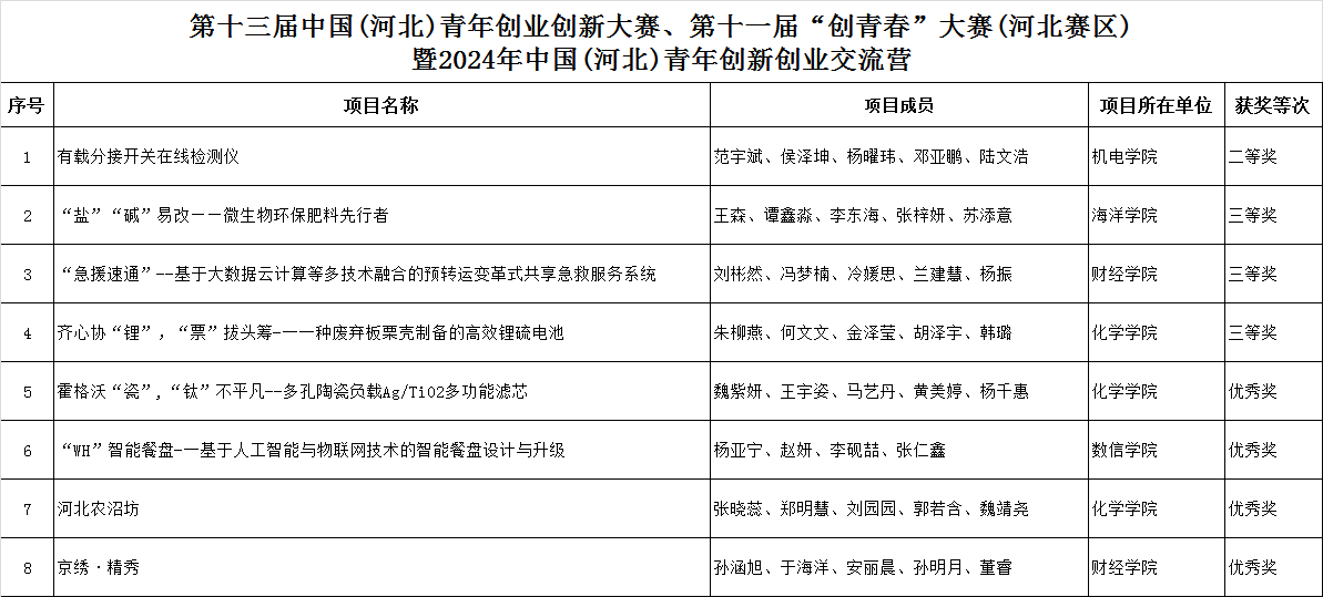 近日獲悉,我校在第十三屆中國(河北)青年創(chuàng)業(yè)創(chuàng)新大賽暨第十一屆“創(chuàng)青春”中國青年創(chuàng)新創(chuàng)業(yè)大賽(河北賽區(qū))比賽中獲得二等獎1項、三等獎3項、優(yōu)秀獎4項。