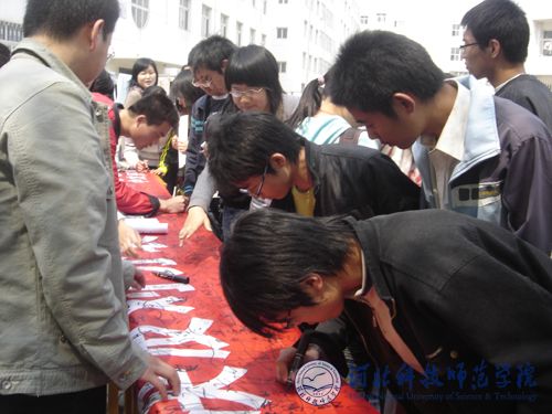 2008年4月17日下午,我校中文系在秦皇島校區和開發區校區同時開展了以“一心維護統一、堅決反對分裂、全力支持奧運”為主題的大型簽名活動。