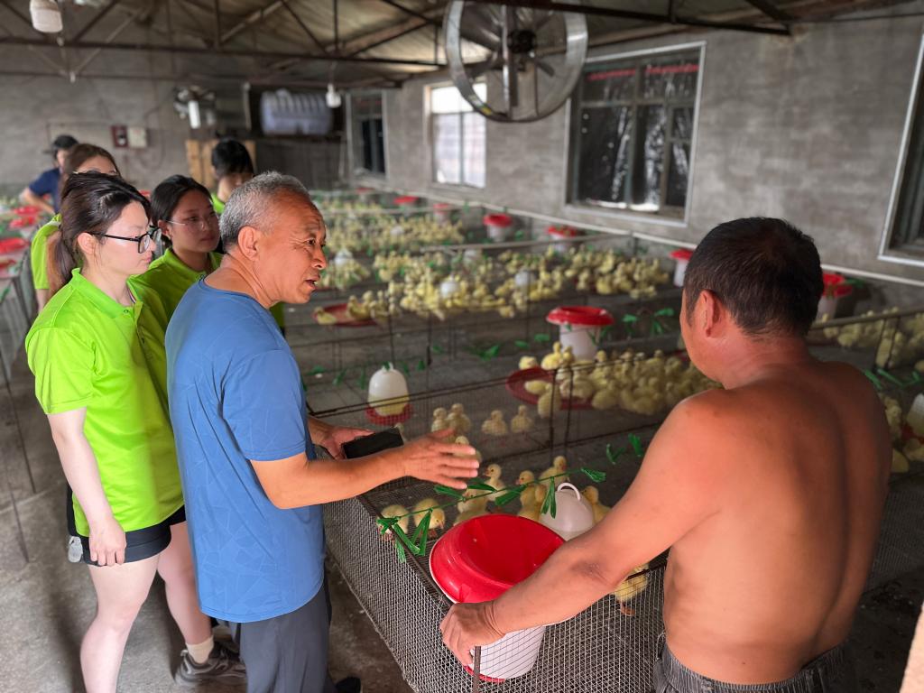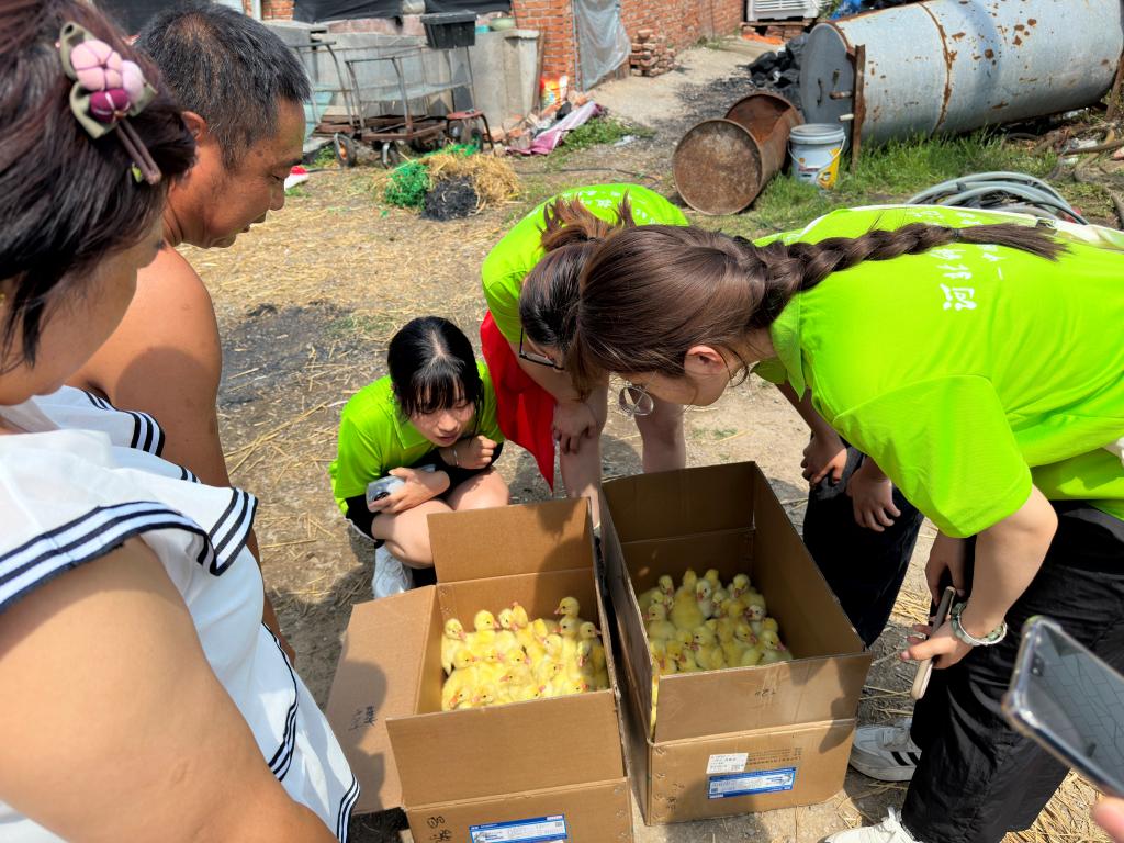 實踐隊首先來到小田莊村育雛鵝廠,隊員們不畏炎熱,在廠房35度高溫下,協(xié)助農(nóng)戶進行清潔和消毒工作,確保育雛環(huán)境安全衛(wèi)生。同時,志愿服務(wù)隊?wèi){借專業(yè)知識,為農(nóng)戶提供合理搭配飼料、精準控制溫濕度等方面的實用建議,助力雛鵝健康成長。