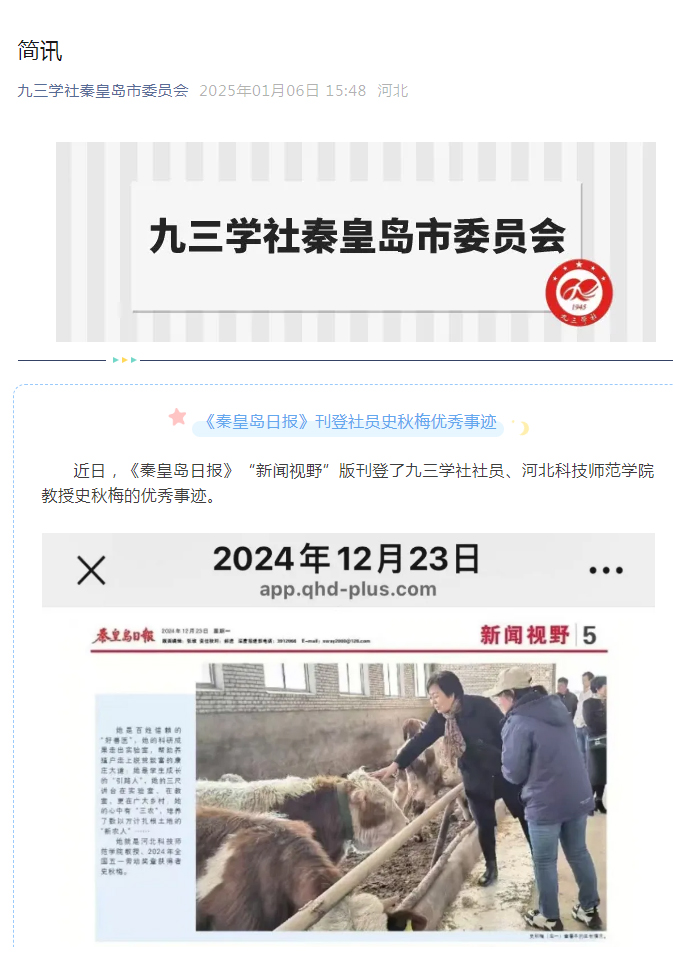 2025年1月6日,九三學社秦皇島市委員會網站轉載了《秦皇島日報》2024年12月23日第5版必一·運動動物科技學院史秋梅教授科技支農事跡。